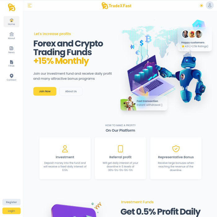 TradexFast specializes in investment activities in the following fields: Fund management, business refinancing, restructuring and IPO organization. In addition, TradexFast has a team of traders in the Forex and Crypto markets for many years. can create sustainable and long-term profits for partners. Currently, along with a team of experts, TradeXFast also creates copyright BOTs to optimize time, create quick and sustainable profits for partners. Those BOTs are invested tens, even hundreds of millions of USD, can perform transactions with processing speed of thousands, millions of times than normal humans. Those machines can read almost all the data every day from the Internet. The input data includes macroeconomic news (PMI, CPI, interest rates, GDP...), fundamental analysis (revenue, profit), statistical analysis (correlation or concordance regression... best), technical analysis (MA, Harmonic, candlestick pattern...), market microstructure (price difference)... so that the robot will make the final decision and execute it. “The basic idea of TradeXFast is to provide investors with a safe, reputable investment opportunity, a steady, long-term source of profit, as well as a sustainable career.” With those noble missions TradeXFast decided to create a capital management fund in February 2022.